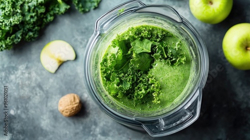 Smoothie blender filled with kale, apple, and spinach, ready to blend for a healthy green drink