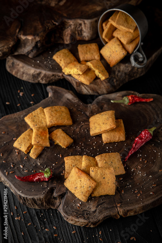 Snack for beer, alcohol. Crispy and crumbly delicious Salty and spicy cookies with seeds, chili peppers, spices and salt. Stylish still life for poster.