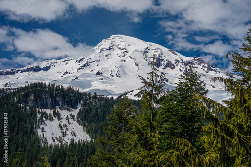Snow capped Mountain set against Blue Sky with Evergreen Trees