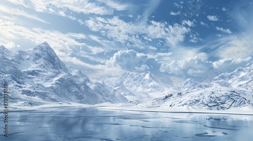 Snow Covered Mountains. Majestic Winter Landscape with Snowy Mountain Range and Glacier Lake