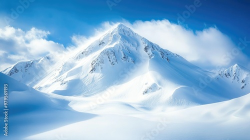 Snow-covered mountain peak under a clear blue sky, with fresh powder creating a pristine winter landscape.
