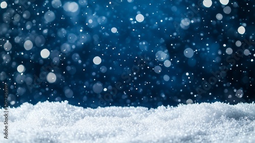 Snowflakes are falling on a snow covered surface with a dark blue background and bokeh