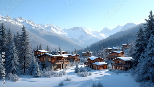 Snowy Mountain Village Winter Scene Alpine Chalets Snow Covered Trees Blue Sky Tranquil Landscape Breathtaking View Serene Atmosphere Cozy Homes Winter Wonderland