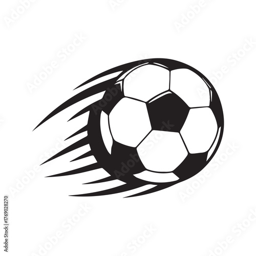 Soccer ball in motion, a flying football with a speed trail effect. Simple black and white vector illustration for a sports game or competition, isolated on a white background.