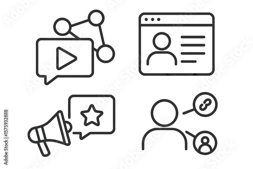 social, media, marketing, web, communication, icon, line, outline, video, sharing, play, network, profile, page, website, app, business, online, review, feedback, link, connection, user, account, testimonial, megaphone, star, digital, promotion, branding, audience, community, interaction, web page, cyberspace, technology, modern, minimal, interface, symbol, illustration, flat, vector, concept, design