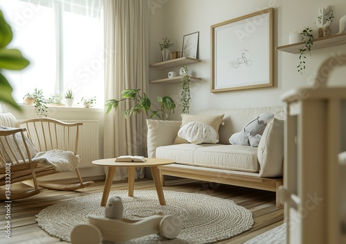 Sofa, armchair, and coffee table in a living room interior with a wooden floor and plants on a shelf. Home decor mockup with a frame hanging above the sofa. Scandinavian-style home decoration