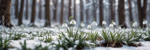 Soft focus image of snowdrops in winter forest with snowy backdrop, winter, snowy