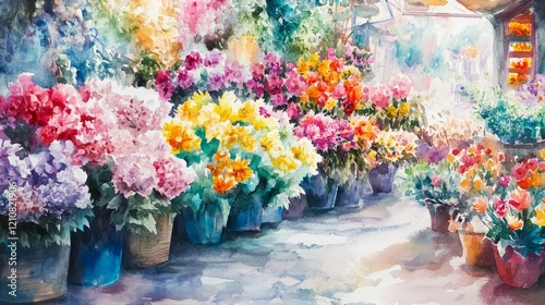 Soft watercolor illustration of a flower market, bright pastel colors, lush floral arrangements, delicate and charming atmosphere, detailed and artistic painting