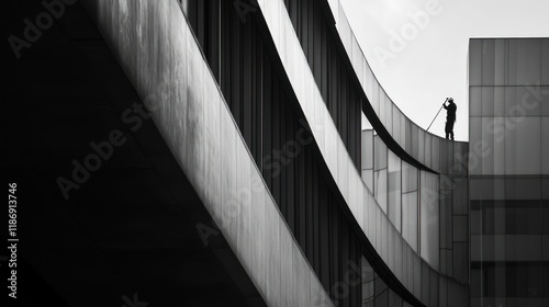 building, architecture, modern, cleaner, silhouette, window, facades, cleaning, men at work, city, urban, grey, monochrome, black, white, concrete, line, curve, structure, geometric, design, abstract, industrial, exterior, contrast, shadow, height, solitary, man, work, professional, elevated, perspective, composition, photo, image, art, visual, graphic, daylight