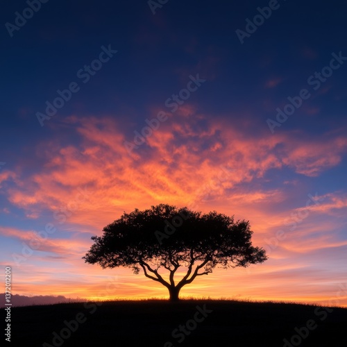 tree, sunset, silhouette, landscape, sky, nature, sun, dusk, scenic, cloud, evening, horizon, twilight, sunrise, dark, lone, calm, beautiful, tranquil, peaceful, orange, blue, idylli, vista, grass, hill, shadow, gold, serenity, vibrant