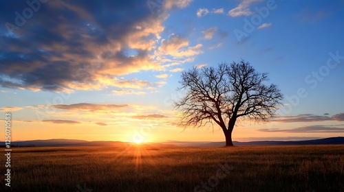 Solitary tree standing in a golden field during sunset with vibrant clouds and a serene landscape in view : Generative AI