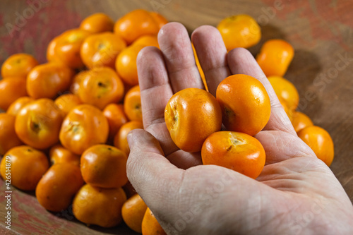 Someone holds a small portion of Butia Capitata, the palm fruit.