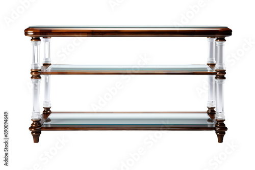 Sparkling Spirals of Glass: A Three Tiered Shelf Display on White or PNG Transparent Background.
