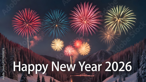 Spectacular New Year 2026 Fireworks Over Snowy Mountain Valley