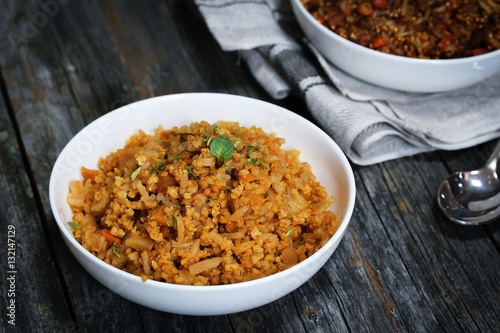 pilaf, healthy, eating, vegan, super, food, dinner, meal, herb, spiced, international, styling, photo, white, bowl, protein, wellness, nourishment, dark, rustic, wooden, grain