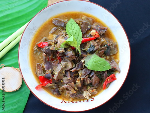Spicy Thai stir-fry with chicken offal, cooked with garlic, chili, and fresh holy basil leaves, delivering a rich, aromatic, and flavorful dish perfect with steamed rice.