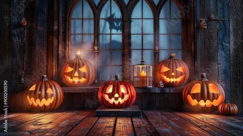 Spooky Halloween scene with carved pumpkins glowing in front of gothic windows. Perfect autumn decoration for a haunted festive ambiance.