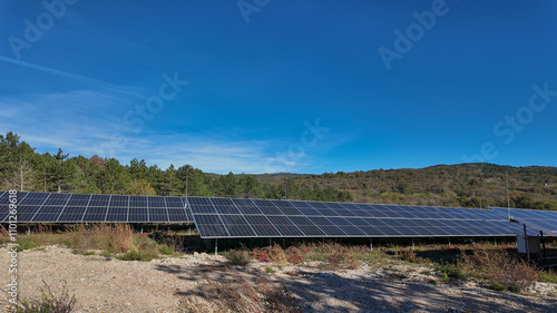 Sprawling solar panels under a clear blue sky highlight renewable energy solutions and sustainability concepts in a rural landscape