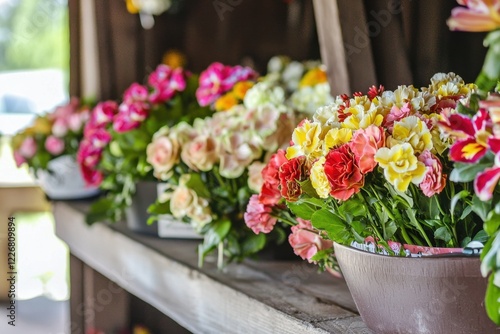 Spring Farmers Market A bustling farmer's market with fresh flowers, fruits, and vegetables displayed on rustic wooden stalls