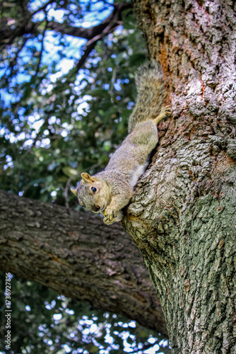 squirrel, tree, nut, eating, climbing, wildlife, nature, animal, rodent, forest, mammal, agile, acrobat, hanging, upside down, balance, bark, paw, whisker, wild, summer, autumn, green background, cute, focused, closeup, texture, fur, survival, adventure, cautious, playful, park, outdoors, brown
