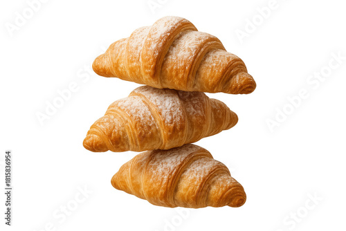 Stack of three golden croissants dusted with powdered sugar, a delightful french pastry for breakfast or dessert, on transparent background