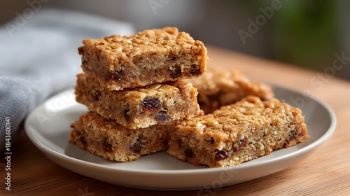 Stacked golden oat bars with dried fruit on a plate a delicious baked dessert