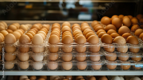 Stacks of brown eggs neatly arranged in plastic cartons, freshness and abundance in grocery display