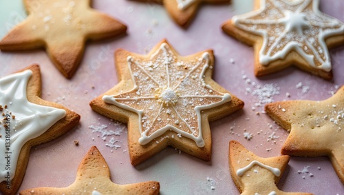 Star-shaped cookies with white icing and sprinkles, arranged on a pastel pink background, creating a festive Christmas theme.