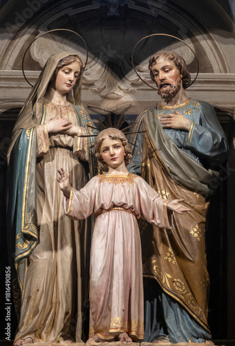 Statue (19th century) of Holy family: Jesus infant, Virgin Mary and St Joseph.