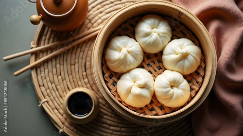 Steamed Manapua with Soy Sauce in Woven Basket (Hawaiian Cuisine)