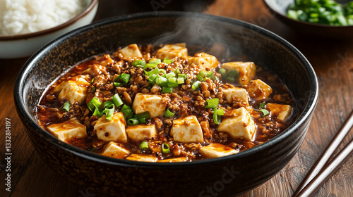 Steaming bowl of Mapo Tofu with minced meat and green onions