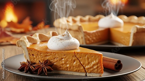 Steaming hot pumpkin pie slice with cozy fireplace glow