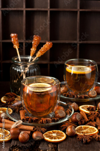 tea, cup, drink, beverage, hot, still life, composition, tasty, glasses, wooden, table, background, dark, decorative, box, spice, anise, cinnamon stick, brown sugar, hazelnut, lemon, fruit