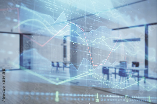Stock and bond market graph with trading desk bank office interior on background. Multi exposure. Concept of financial analysis