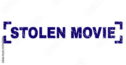 STOLEN MOVIE title seal print with corroded texture. Text title is placed between corners. Blue vector rubber print of STOLEN MOVIE with unclean texture.