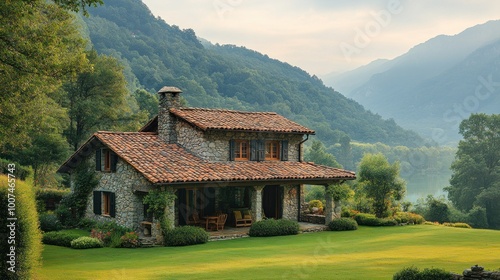 house, stone, mountain, landscape, nature, sky, green, grass, tree, hill, home, roof, window, garden, view, exterior, rural, country, architecture, residential, property, estate, villa, wood, outdoors, luxury, serenity, peaceful, tranquil, beautiful, calm, natural, classic, elegant, idylli, vacation, dream, summer, spring, morning, sun, light, hazy, fog, mist, warm, soft, wide, angle