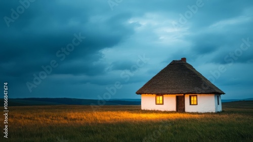 Straw roof on ancient farmhouse, rural simplicity, moody evening lighting