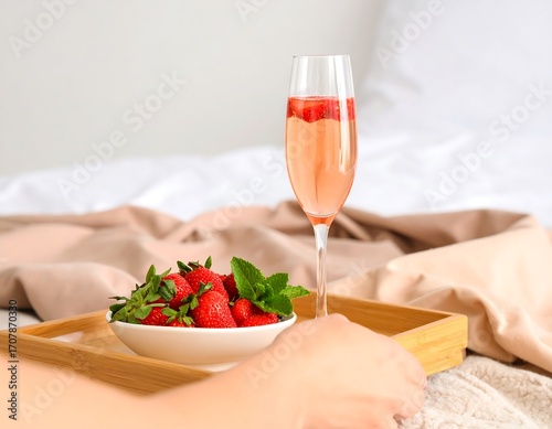 champaign, strawberry, drink, bed, tray, bowl, mint, pink, fresh, luxury, morning, relaxation, treat, dessert, celebration, romantic, refreshing, summer, woman, hand, light, elegant, smooth, delicious, healthy, freshness, simple, cosy