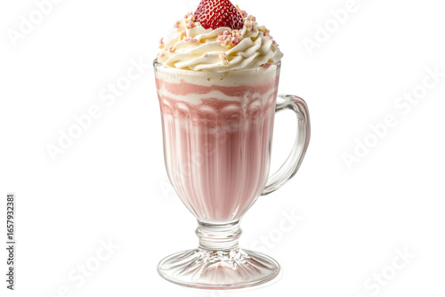 Strawberry milkshake in tall glass with whipped cream isolated on transparent background