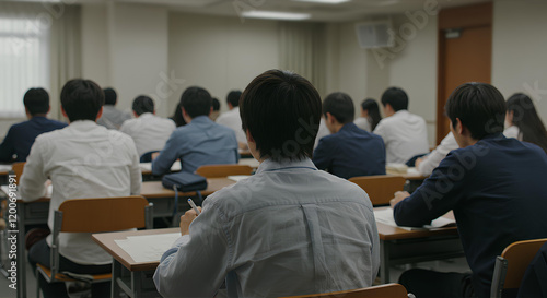 exam, people, man, woman, japanese, asian, boy, woman, stress, concentration, ease, start, seating, undo, answer, seated, place, uniform, student, solemn, back, copy space, daytime, indoor, indoor, classroom, workshop, class