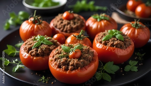 Stuffed tomatoes with ground meat and herbs, served on a dark plate with a blurred green background