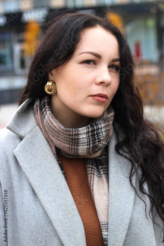 stylish curly girl in a coat with massive earrings, portrait