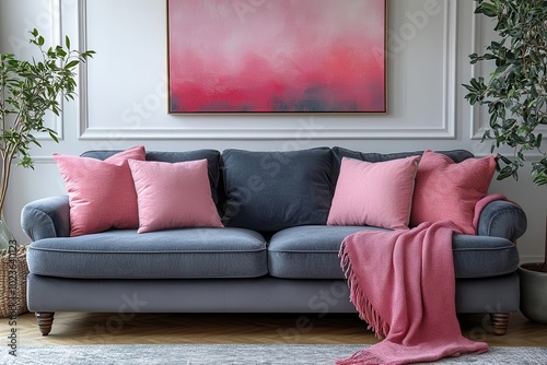 stylish grey sofa adorned with pink pillows and a cozy blanket set against a white wall featuring abstract art reflecting modern and chic interior design