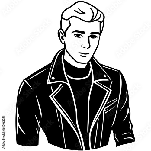 man, male, portrait, illustration, drawing, black, and, white, monochrome, leather, jacket, biker, turtleneck, fashion, style, cool, modern, vintage, retro, rocker, rebel, youth, photogenic, iconic, graphic, vector, outline, minimalist, character, design