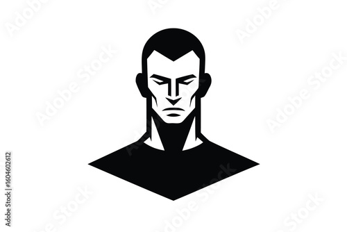 man, portrait, stylised, black-and-white, geometric, shape, minimalist, design, modern, serious, gaze, face, art, illustration, graphic, vector, strong, visual, monochrome, silhouette, simple, bold, contemporary, human, head