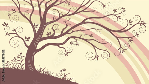 Stylized tree with swirling branches and leaves against a pastel striped background design element