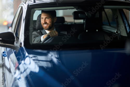 car, owner, purchase, salon, client, businessman, examining, retail, choice, suit, client, vehicle, buy, shop, success, luxury, buyer, dealer, expensive, choosing, male, person, dealership, checking, showroom, man, new, smiling, happy, beard, sitting, testing, caucasian, blue