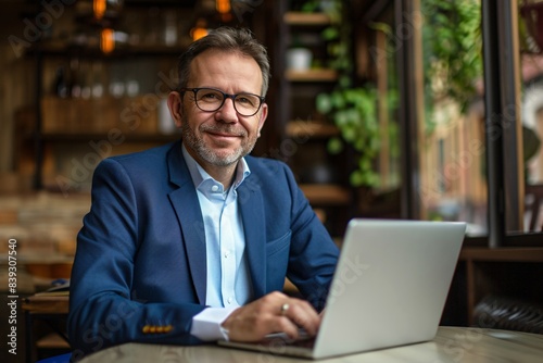 Successful Middle-Aged Businessman Working on Laptop in Office - Confident CEO Portrait in Blue Suit Jacket | 8k Real Photo