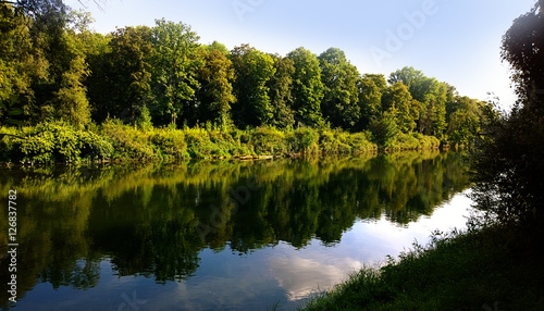 Summer in Bavaria, Isar river with calm waters and sky reflection