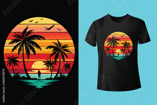 palm, beach, summer, tropical, tree, sun, sea, illustration, sunset, nature, ocean, travel, hawaii, landscape, holiday, design, palm tree, t-shirt